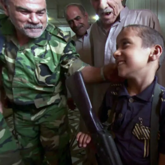 Ev kısa süre içinde akraba ve komşularla doluyor. İki küçük çocuk kalabalığın içinden öne doğru itekleniyor. Abdullah ve Abdülhadi, 10 ve 12 yaşlarındalar. Kalabalığın en önüne tökezleyerek çıkıyorlar. Her birinin elinde Kalaşnikof var.