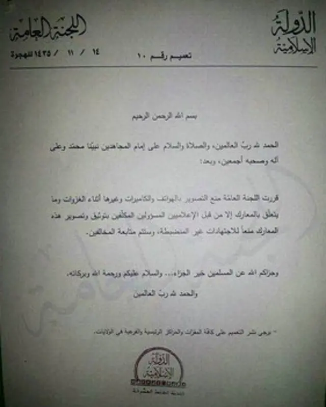 IŞİD tarafından "disiplinsizliği önlemek adına" yayımlanan muhtıra kapsamında, militanların fotoğraf çekmeleri, cep telefonu ve kameralarla görüntü almaları yasaklandı.