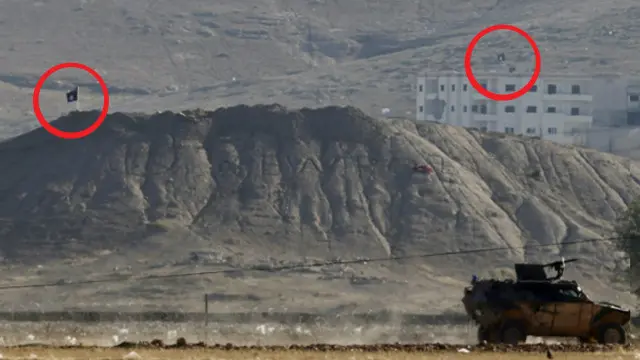Kobani'nin doğusunda bir tepeye ve bir de bina çatısına IŞİD bayraklarının dikildiği de <bold><link type="page"><caption> görüntülendi.</caption><url href="http://www.bbc.co.uk/turkce/multimedya/2014/10/141006_vid_isid_bayrak" platform="highweb"/></link></bold>