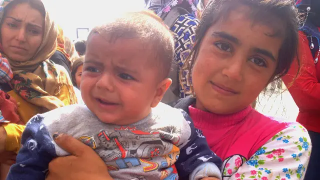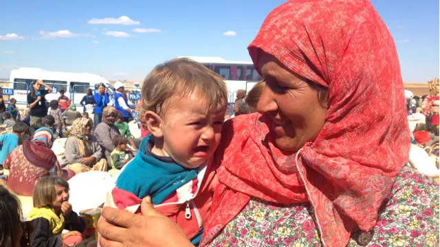 Ya yeni doğmuş bebeklerini taşıyorlar ya da çocuklarının ellerini tutuyorlar, ki çocukların çoğu mavi gözlü. Çocuklar ise sanki, sınırda kayıt için değil de okulda sınıfa girmek için sıra bekliyormuş gibi çantalarını taşıyorlar sırtlarında. Erkekler güneşten korunmak için parlak renkli puşiler sarıyorlar başlarına.