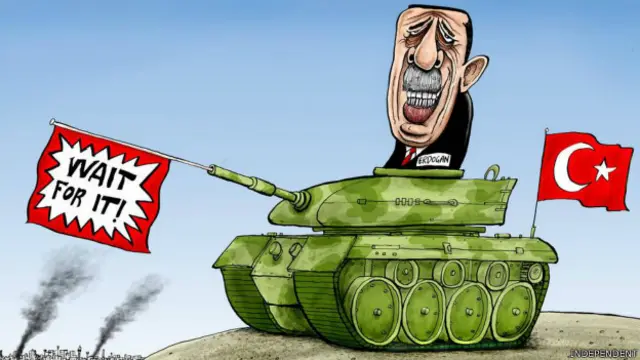 Independent gazetesinin 'günün karikatürü' köşesi de Türkiye'nin Suriye politikasını konu alıyor. Karikatürde Cumhurbaşkanı Recep Tayyip Erdoğan namlusu Kobani'ye dönük bir tankın içinden gülümserken, tank namlusundan 'Bekleyin' yazısı çıkıyor.