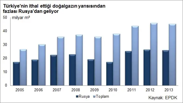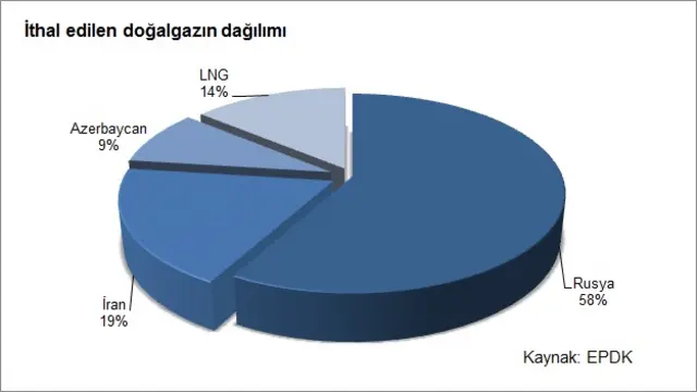 Türkiye ekonominin çarklarını döndüren doğalgazın yüzde 98'ini ithal ediyor. Enerji Piyasası Düzenleme Kurumu (EPDK) verilerine göre 2013'te ithal edilen gazın yüzde 58'i ise Rusya'dan alındı.