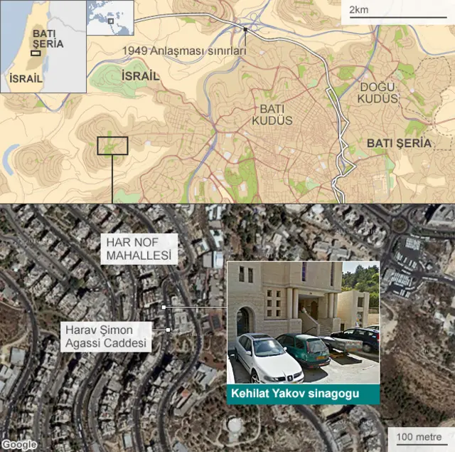 Har Nof mahallesindeki sinagoga düzenlenen saldırıda, ellerinde balta ve bıçaklarla giren iki saldırganın olay yerinde İsrail polisi tarafından vurularak öldürüldüğü bildirildi.