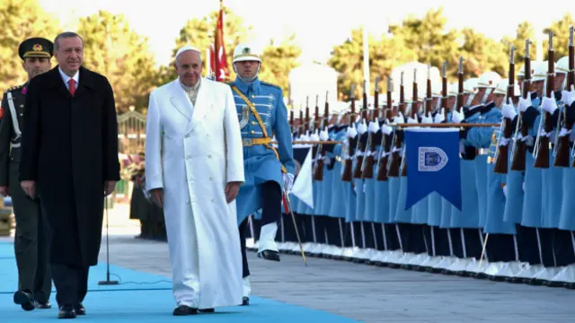 Papa Francesko dün de Ankara'da Anıtkabir'i ziyaret etmiş, ardından yeni yapılan Cumhurbaşkanlığı Sarayı'nda, Cumhurbaşkanı Recep Tayyip Erdoğan'la temaslarda bulunmuştu.