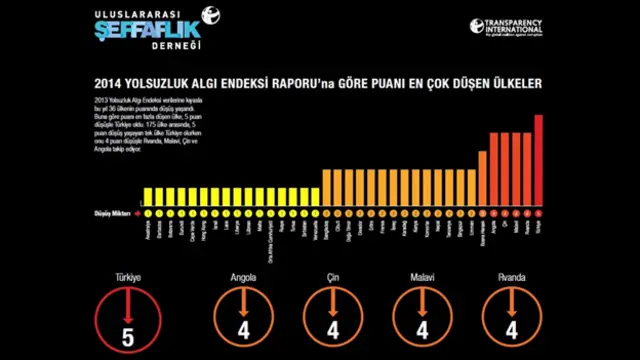 Uluslararası sivil toplum kuruluşu Şeffaflık Örgütü (Transparency International), bu yılın <link type="page"><caption> Yolsuzluk Algı Endeksi sonuçlarını</caption><url href="http://www.seffaflik.org/detay_tr.asp?GID=74&MenuID=75&VeriID=248" platform="highweb"/></link> açıkladı. Türkiye 2014'te endekste puanı en çok düşen ülke oldu.