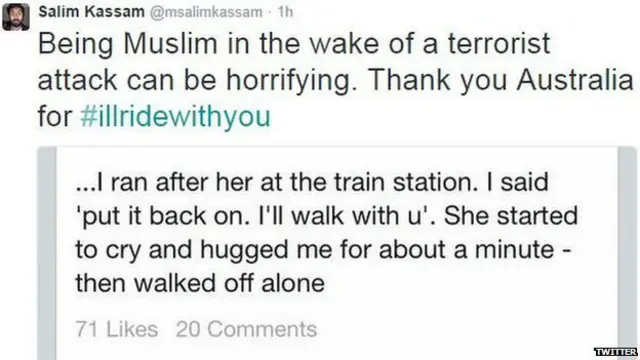 Avustralya'nın Sidney kentinde silahlı bir kişi bir kafede onlarca kişiyi rehin alırken, ülkede Müslümanlara karşı düşmanca bir tepki doğmasından endişe eden binlerce kişi sosyal medyada kampanya başlattı. Bu kişiler, Müslümanlara destek mesajları attı.