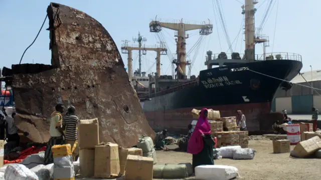 Bir zamanlar rakip milis gruplarının kontrolü ele geçirmek için savaştığı bu limanlarda şimdi, dev konteynır gemileri çimento, araç, makarna ve pirinçten oluşan yüklerini boşaltmak için yan yana dizilmiş durumda. Dev vinçler bir yukarı bir aşağı hareket ediyor. Bazılarının operatörü Türk, bazılarının ki Somalili.