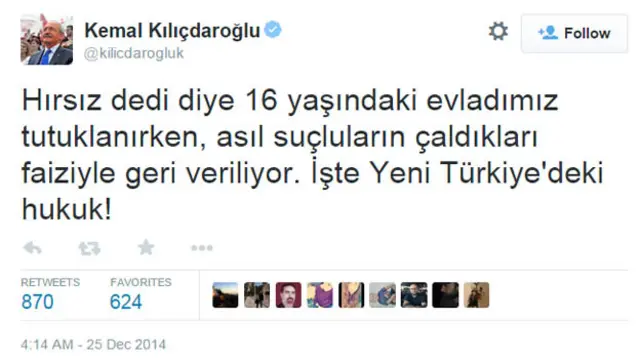 Cumhuriyet Halk Partisi (CHP) Genel Başkanı Kemal Kılıçdaroğlu ise Twitter hesabından yaptığı açıklamada, M.E.A.'nın tutuklanmasına tepki gösterdi.
