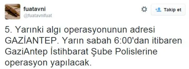 Twitter'de dün akşam Fuat Avni hesabından bugün Gaziantep'te istihbarat şube polislerine operasyon yapılacağı duyurulmuştu.
