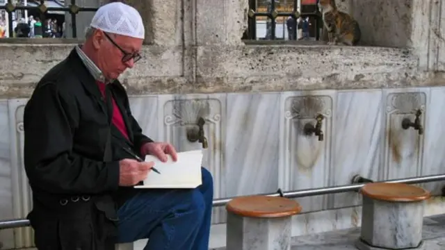 “Ona burada bir sergi açmıştık. Wolinski muhafazakarlaşan ortamı merak etmişti. Çarşamba’ya, Eyüp’e gitmiştik beraber. Oturdu onları çizdi. Eyüp’te tebliğcilerden biri geldi. Onu Müslümanlığa davet etti. Namaz takkesini verdi. Bu fotoğraf da Eyüp Camii’nde çekildi.”