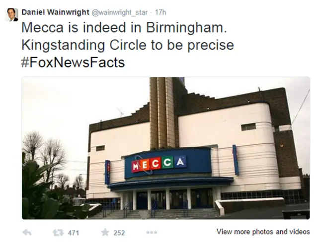Bir başka kullanıcı ise şehirde bingo oyununun oynandığı Mecca isimli binanın fotoğrafını paylaşarak. "Aslında Mekke Birmingham'da. Açık adres söylemek gerekirse Kingstanding meydanında" yazdı.