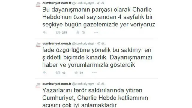 Türkiye'de, Cumhuriyet gazetesi Charlie Hebdo'nun özel sayısından dört sayfalık bir seçkiye bugünkü sayısında yer veriyor.