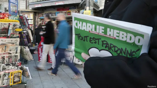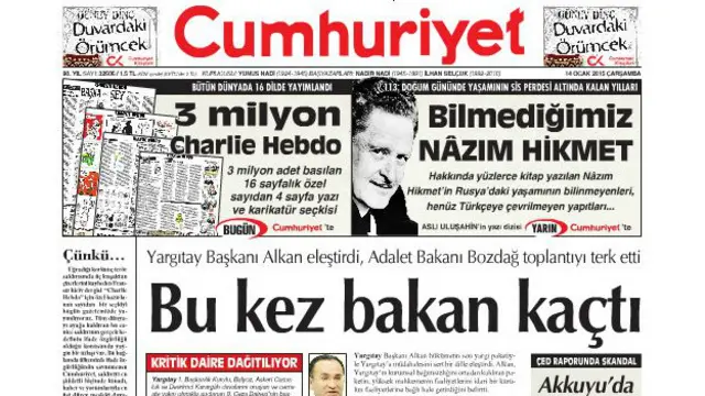 Fransız mizah dergisi Charlie Hebdo'nun, kapağında Muhammed Peygamber karikatürünün yer aldığı son sayısıdan dört sayfalık bir seçki, Cumhuriyet gazetesi <bold><link type="page"><caption> tarafından Türkçe olarak yayımlandı.</caption><url href="http://www.bbc.co.uk/turkce/haberler/2015/01/150114_charlie_hebdo_turkey.shtml" platform="highweb"/></link></bold>