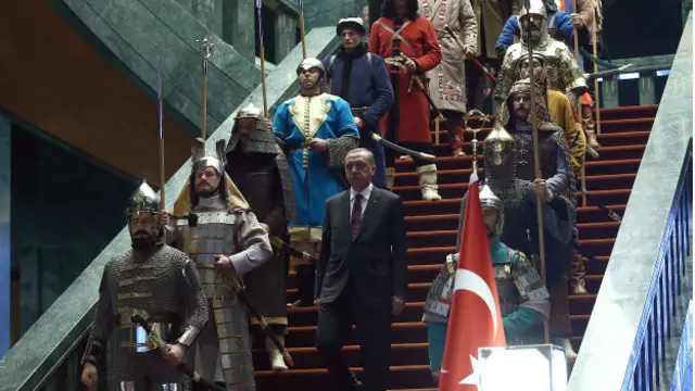 "Benzer şekilde Erdoğan'ın son olarak sarayda kendisini ziyaret eden yabancı konukları eski imparatorluklardan Türk savaşçılar şeklinde giyinmiş 16 askerle karşılaması da, hicvin ötesinde bir durum. Ancak Erdoğan bu durumda da ciddiyetini koruyabilir çünkü burada konu saray değil. Ve Türkiye'de bunalıma girip Twitter ortamında bu tabloyu aşağılayan büyük şehirde yaşayan kesimin aksine, Erdoğan'ın destekçileri haberleri pasif televizyon kanallarından alıyor. Erdoğan'ın odak noktası iç politikaya yönelik ve taktiksel olsa da, bu değişken ve otoriter davranış Batı'yı, Sayın Erdoğan'ın Türkiyesi ile ittifakını yeniden düşünmeye zorlayabilir. Nihayetinde ise Osmanlı gaflı bir pandomim şov da olsa, simgeciliğin dahi bir özünün olması gerekir."