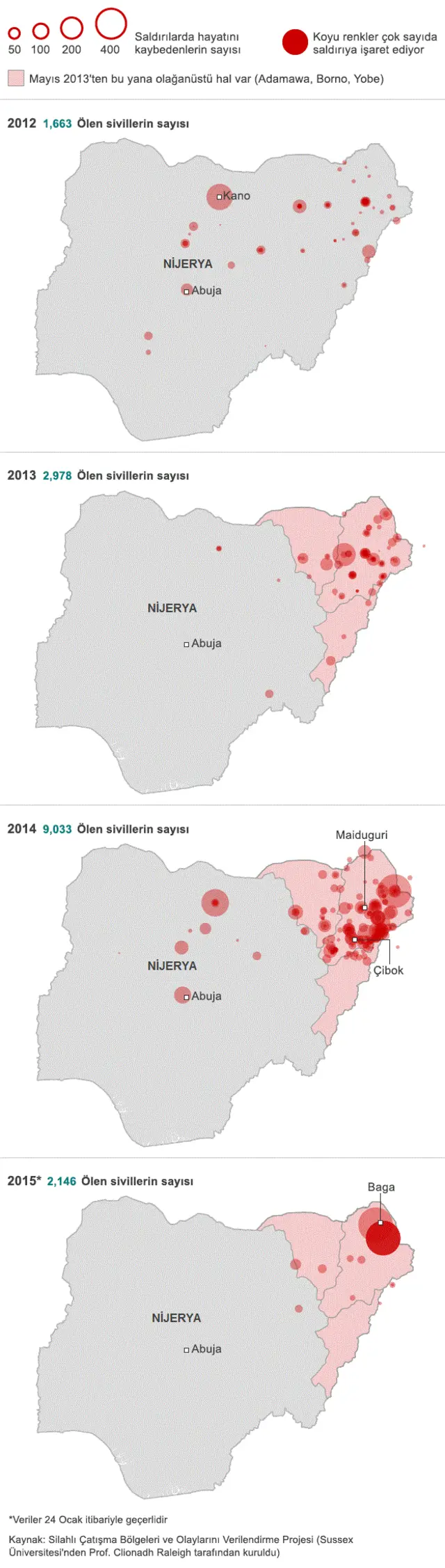 Haritalar Boko Haram'ın faaliyetlerinin aşamalı olarak kuzey doğudaki Adamawa, Borno ve Yobe bölgelerine odaklandığını ve 2014 yılında saldırıların yoğunluğunun arttığını gösteriyor.