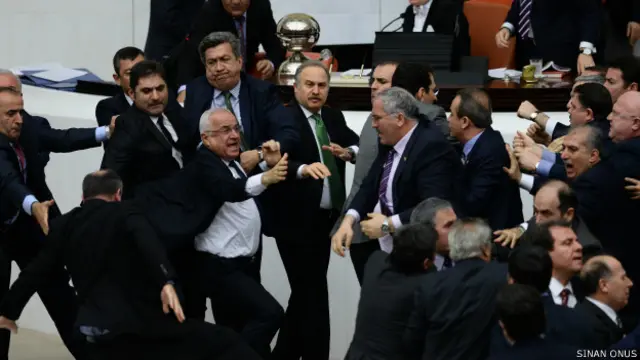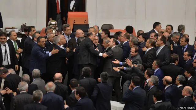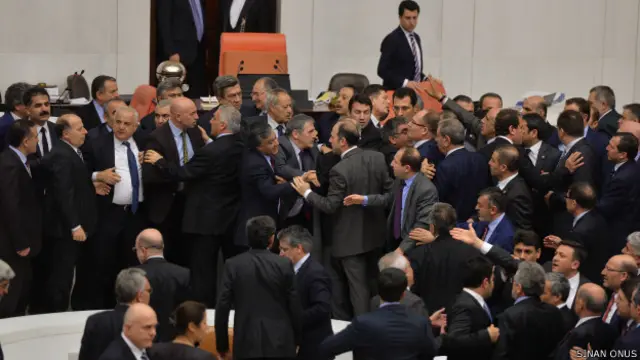 AKP'li milletvekillerinin kürsüye doğru koştuğunu gören muhalefet milletvekilleri de hızla yerlerinden kalktı. Başkanlık Divanı'nın önünde tekme ve yumruklarla kavga başladı.