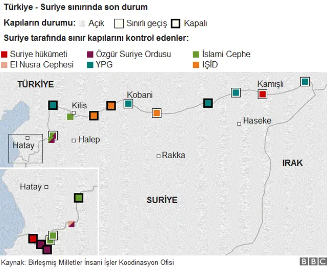 911 kilometrelik Türkiye - Suriye sınırının Suriye tarafında sınır kapılarının kontrolü ülkedeki çatışmalar sonucunda farklı silahlı güçlerin eline geçmiş durumda.