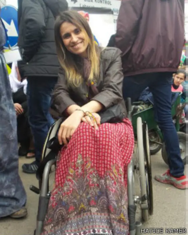 Diyarbakır'da 30 yaşındaki Ebru Atıcı mitinge tekerlekli sandalyesiyle gelmiş.