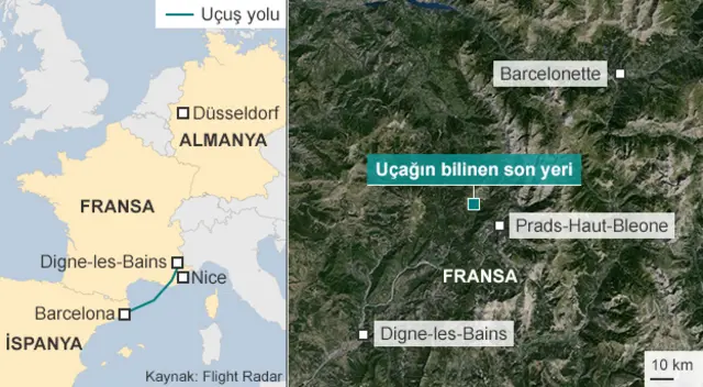 Uçağın Digne-les-Bains kasabası yakınlarında düştüğü belirtiliyor. Digne-les-Bains, Fransa'nın Akdeniz kıyısındaki Nice kentinin 100 kilometre kuzeyinde bulunuyor.