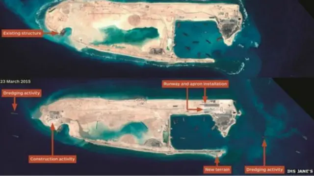 IHS Jane's Defence Weeekly dergisi, Spratly adalarında, Fiery Cross mercan kayalıklarının kum ve betonla doldurulduğu alandaki pistin uzunluğunun üç kilometreyi bulabileceğini yazdı.