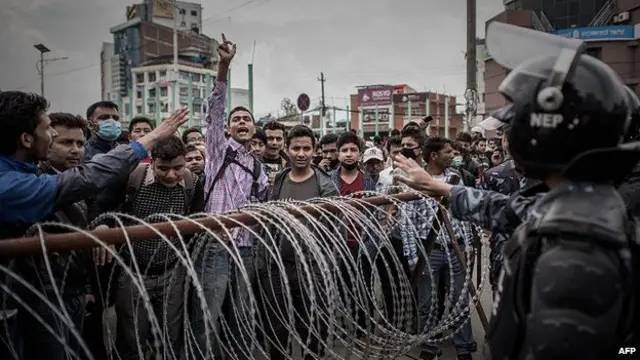 Katmandu'da kent dışına çıkmak isteyen kalabalıklar, ulaşım hizmetlerinin eksikliğine ve yardım malzemelerinin dağıtılmasındaki gecikmelere tepki göstererek polisle çatıştı.