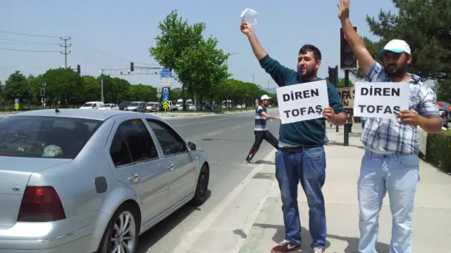Her korna, alkışlar ve ıslıklarla karşılık bulurken, yol kenarına dizilmiş işçiler ellerinde arabaları “Tofaş için korna çalmaya” çağıran pankartlarla destek topluyor.