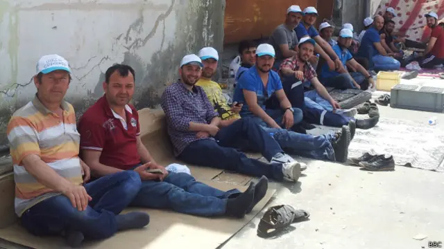 BBC Türkçe'nin eylemlere dair yazdıkları haberleri okuyan işçiler gülerek yaklaşıyor.