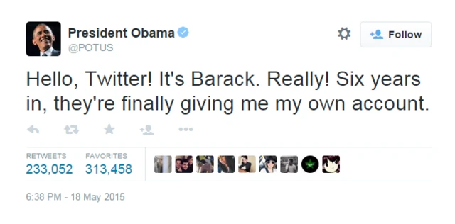 Obama'nın Twitter'da paylaştığı ilk tweet "Merhaba Twitter! Ben Barack. Gerçekten! Altı yılın ardından, sonunda bana kişisel hesabımı veriyorlar" oldu.