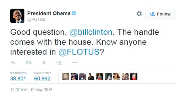 Obama, @POTUS hesabının Beyaz Saray'da kalacağını belirtip "Güzel soru @billclinton. Kullanıcı adı Beyaz Saray'ın. @FLOTUS ile ilgilenen birini tanıyor musun?" dedi.