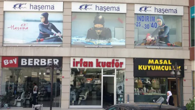 Üzerinde sağlık ve cinsel gücü artırıcı ürün ilanları bulunan doğal ürün mağazasının yanında, helal gıda afişi bulunan bir kermes, onun yakınlarında kadınlar ve erkeklerin ayrı spor yaptığı bir fitness salonu onun yakınlarında da Kuveyt Türk Bankası'nın bir şubesini görebiliyorsunuz.