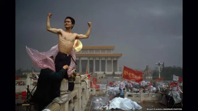 Stuart Franklin daha çok “alışveriş torbalarıyla tankın önünde duran adam” fotoğrafıyla tanınıyor. Franklin, bu fotoğrafın ise Tiananmen Meydanı’ndaki “ayaklanmanın ruhunu kristalize ettiğini” belirtiyor.