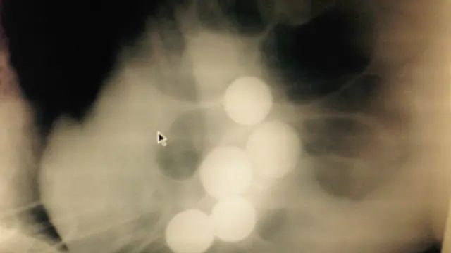 Yedi yaşındaki Alman çoban köpeğinin sindirim sisteminde röntgenle tespit edilen toplar acil bir ameliyatla alındı.