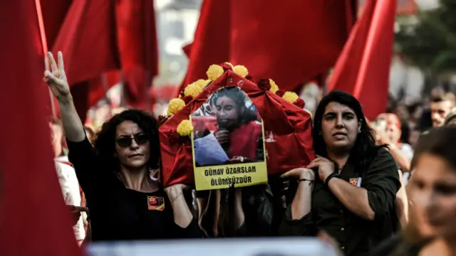 "Günay Özarlan Ölümsüzdür" yazılı pankartla yürüyüş yapan grup sık sık slogan attı. Cenazeyi kadınlar taşıdı. Polis helikopteri havadan grubu takip etti.