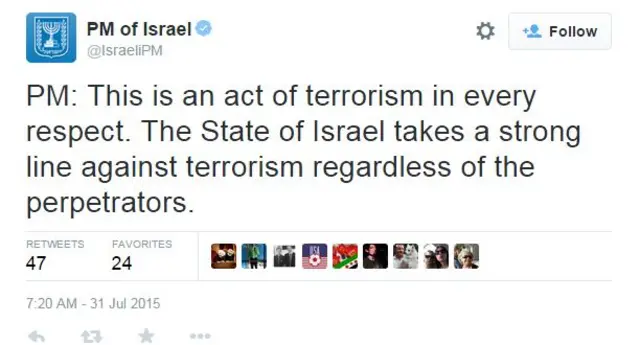 Twitter hesabından açıklama yapan Netanyahu "Bu her açıdan bir terör eylemidir. İsrail devleti yapanın kim olduğuna bakmaksızın terörizme karşı sert bir tavır sergiler." dedi.