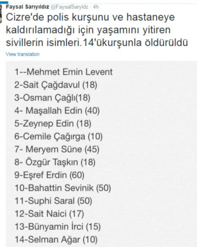 "21 kişinin hepsi Cizreli insanlar. Belki 1-2'si dışında hepsi sivil. 6-7'si tansiyon ve benzeri rahatsızlıklar nedeniyle fenalaşıyorlar. Hastaneye taşınamadıkları için evde ölüyorlar. Ama 10'un üzerinde insanın hepsi polis kurşunuyla yaşamını yitirdi. Bu ülkenin batısı Cizre'de olup bitenlere ilişkin bilgilendirilmiyor.
