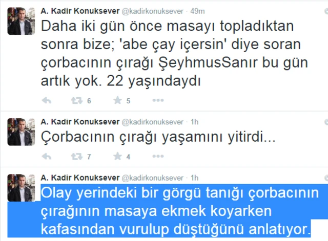 Diyarbakır'daki Al Jazeera Türk muhabiri Kadir Konuksever de, Twitter mesajında, bir görgü tanığının, Sanır'ın masaya ekmek koyarken kafasından vurulup düştüğünü anlattığını aktardı.