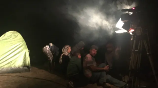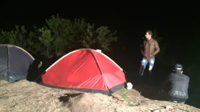 Hafif tepelik alanda ara ara çadırlar kurulmuş göçmenler tarafında. Çoğunluğu ise çocuklu aileler ve gençler oluşturuyor.