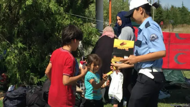 Öğle saatinde vardığım otogarda burada bekleyen yaklaşık 500 göçmene kumanya dağıtılıyor göçmenlere. Verilen bilgiye göre valilikte bir koordinasyon masası oluşturulmuş ve hem özel kuruluşların hem de valiliğin sponsorluğunda göçmenlerin ihtiyaçları karşılanıyor. Bir yandan da polisler çocuklara çikolata dağıtıyor.