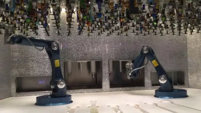 Robot şeklindeki kol kokteyli karıştırıyor ve kırılmasın diye plastik bir bardağa koyuyor. Bardak bir bölmeye yerleştiriliyor çünkü robot içkiyi dökerken zaman zaman taşırabiliyor. Bunu biraz gösterişle yapan robot, bazen kokteyli dökmeden önce çalkalıyor da.