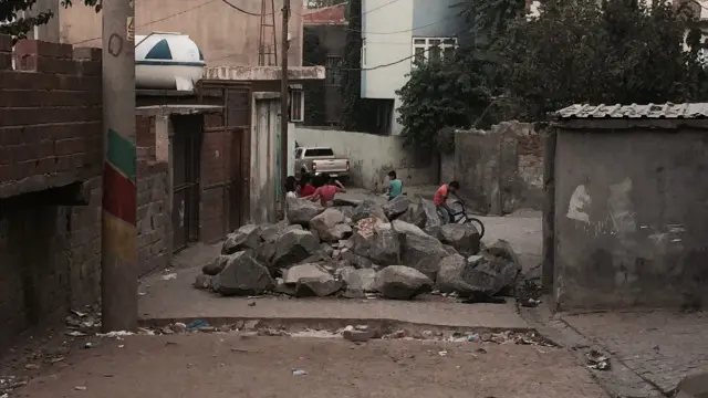 Bir duvarda "Biz Kürdüz" yazısı dikkat çekiyor. Başka duvarlara PKK'nın, örgütün gençlik yapılanması YDG-H'nin isimleri yazılmış. Çocuklar zırhlı polis araçları önünde oyunlar oynuyor.