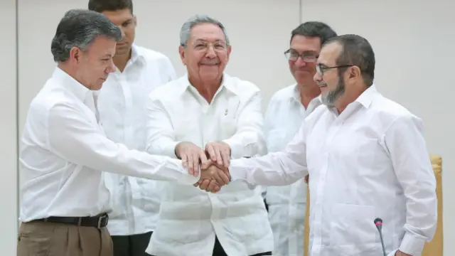 'Timoçenko' ve Timoleon Jimenez takma adıyla bilinen Farc lideri Rodrigo Londono ve Santos, açıklamanın ardından tokalaştı. Görüşmelere ev sahipliği yapan Küba Devlet Başkanı Raul Castro da Farc lideri ve Santos'un tokalaşmasına katılıp ikilinin elini sıktı.