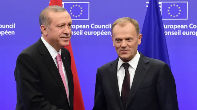 Erdoğan AB Konseyi Başkanı Donald Tusk ile Brüskel'de düzenlediği ortak basın toplantısında, "Ağırlıklı olarak mülteci konusunu konuştuk. Türkiye olarak 4 yılı aşkın süredir Suriye ve Irak'tan kaçan mültecilere kapıları açtık, yüksek ilgi ve alaka gösteriyoruz. Hiçbir ayrım yapmadan gerçekleştirdik ve Türkiye'ye gelenleri de asla diğer ülkelere göndermedik. Bugün ülkemizde 2.5 milyona yakın göçmen var" dedi.