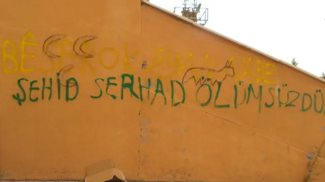Çatışma sadece cadde ve sokaklarda değil, duvarlarda da sürdürülmüş görünüyor. YDHG’lilerin bu okul duvarına yazdığı “ Şehid Serhad ölümsüzdür” yazısının üzerine, daha sonra üç hilal ve kurt resmi eklenmiş.