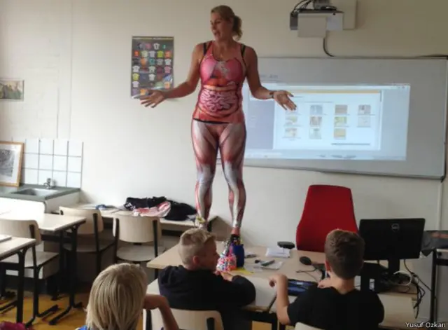 Heerkens, biyoloji dersinde üst üste giydiği bu kıyafet yardımıyla vücut yapısını anlatmaya başladı.