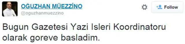 Gazetenin bugünkü künyesinde ise Yazı İşleri Koordinatörü olarak Oğuzhan Müezzino'nun ismi yer aldı. Müezzino göreve başladığını <link type="page"><caption> Twitter</caption><url href="https://twitter.com/oguzhanmuezzino" platform="highweb"/></link> hesabından da duyurdu.