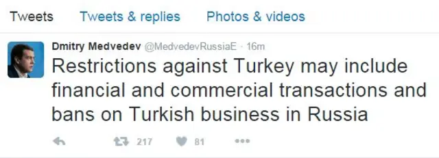 Rusya Başbakanı Dimitri Medvedev Türkiye'yle birlikte yürütülen ortak yatırım projelerinin dondurulması için talimat verirken Twitter hesabından da "Türkiye'ye yönelik kısıtlamalar finansal - ticari para aktarımlarını ve Türk işletmelerine yönelik yasakları da kapsayabilir" dedi.