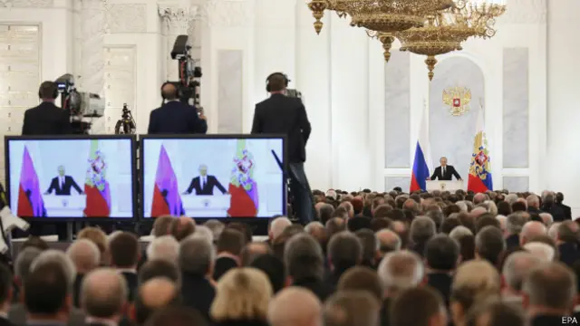Putin'in konuşmasını Rusya Parlamentosu'nun alt ve üst kanatları olan Federasyon Konseyi ile Duma’dan yaklaşık 1000 milletvekili ile 500'den fazla yerli ve yabancı basın mensubu izledi.