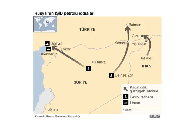 Rusya’nın temel iki iddiası var. İlk iddiaya göre Rakka’dan gelen petrol Suriye- Türkiye sınırındaki Azez üzerinden İskenderun limanına götürülüyor. Bu iddiaya göre limanda sadece Suriye’den gelen petrolün denizdeki tankerlere yüklenmesine ayrılmış bir bölüm var. Ayrıca Suriye’den gelen petrol ve petrol ürünlerinin bir kısmının Türkiye içinde satıldığı söyleniyor.