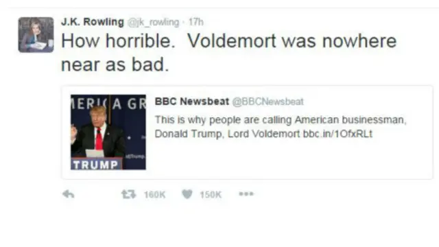 Rowling Trump'ı romanlarındaki kötü karakter Lord Voldemort'la kıyaslayarak "Ne kadar korkunç. Voldemort bile bu kadar kötü değil" yazdı.