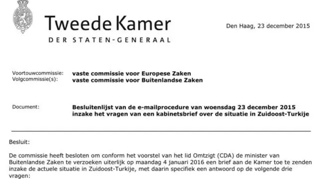 Hollanda Parlamentosu, Dışişleri Bakanı Bert Koenders'dan Güneydoğu'daki gelişmeler ve Hollanda hükümetinin bu konudaki girişimlerine ilişkin 4 Ocak'a kadar meclisi bilgilendirmesini de istedi.